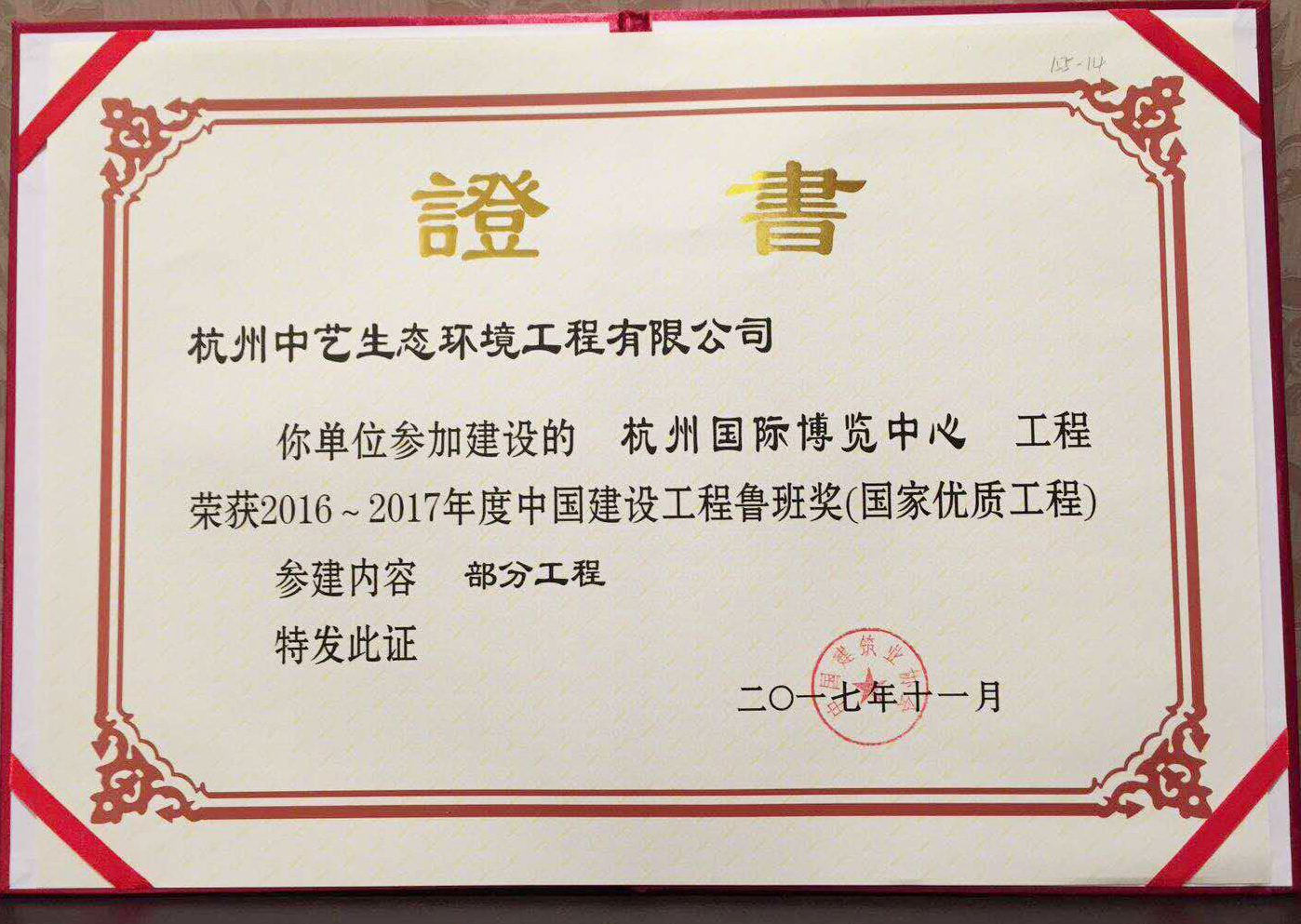 11月6日,中國建筑業協會在北京召開紀念“魯班獎”創立30周年暨2016~2017年度創精品工程經驗交流會。由太陽成集團tyc環境全資子公司——杭州中藝生態環境工程有限公司參建的杭州國際博覽中心項目喜獲中國建設工程質量最高獎———中國建設工程魯班獎(國家優質工程)。